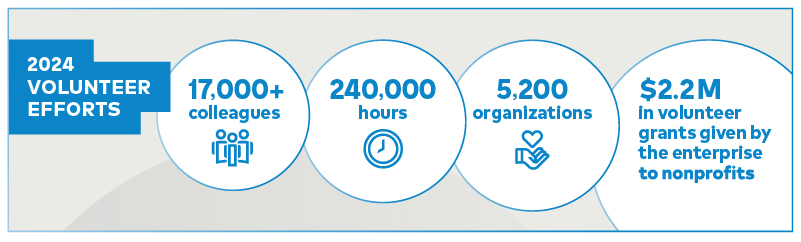 Also in 2024, more than 17,000 colleagues volunteered almost 240,000 hours to over 5,200 organizations, resulting in more than $2.2 million in volunteer grants given by the enterprise to nonprofits of their choice.